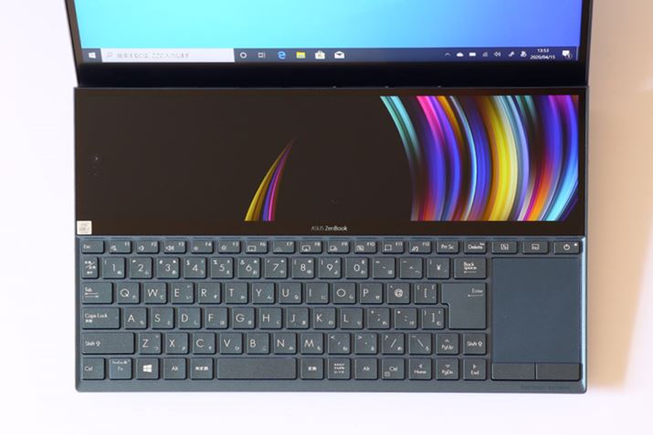 キーボードの奥に「ScreenPad+」というセカンドディスプレイを搭載するZenBook Duo UX481FL。昨年発売した「ZenBook Pro Duo」と同じスタイルだが、メインディスプレイのサイズが15.6型から14型へ小型化され、機動性がアップしている