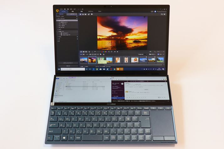 「ScreenPad+」と呼ばれるセカンドディスプレイでできることは、ZenBook Pro Duoとほぼ同じ。メインディスプレイで動画や画像を編集しながら、セカンドディスプレイにメールソフトや音楽再生ソフト、SNSなどを表示するといったことができる。アプリにもよるがツールやパレットをScreenPad+に表示しながら、メインディスプレイで作業するといったことも可能。なお、ScreenPad+は横長のディスプレイなので、メインで作業するスペースというよりは補助的な使い方となるだろう。