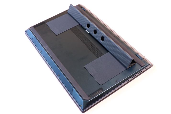 スタンドは底面に粘着テープで固定する。使うときだけ折り曲げてスタンドにできる。吸排気口をふさがないように工夫されている