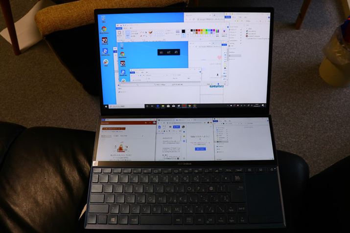 しばらく使っていると、2画面の角度の違いから見え方の違いが気になってくる。どうにか解消できないかといろいろ試したところ、ベストな使い方が見つかった。それが膝上での利用だ。適度な角度がついて、両方のディスプレイの見え方がほぼ同じとなり、かつタッチしやすくなる。キーボードを長時間使う場合は机の上でスタンドを使ったほうがいいが、タッチメインで作業しながら、ときどき文字を打つという使い方なら膝上が一番便利に使えた。