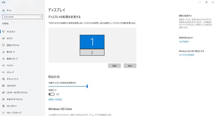 ディスプレイの設定をチェックすると、一般的なマルチディスプレイのように2つのディスプレイが上下に並んでいることが確認できた