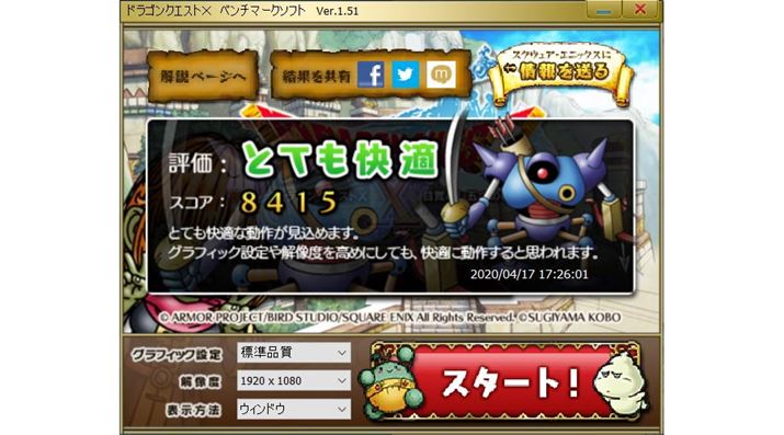「ドラゴンクエストXベンチマークソフト Ver.1.51」は、グラフィック設定を「標準品質」にすれば「とても快適」という結果だった