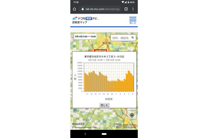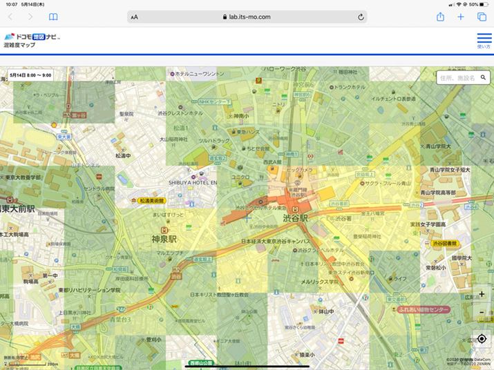 NTTドコモは、2020年5月11日、同社の地図アプリ「ドコモ地図ナビ」(iOS/Android)の有償機能である「混雑度マップ」を、期間限定で無料開放した。「混雑度マップ」では、メッシュで区切られた全国の混雑度情報を確認可能。また、メッシュごとに“最短1時間”〜“24時間前”の範囲で混雑度をグラフで確認できる。