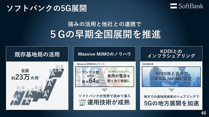 ソフトバンクの5Gでは、既存の4G用の電波や基地局の積極的な活用、Massive MIMO技術、KDDIとのインフラシェアリングなどで早期の全国エリア展開を目指す