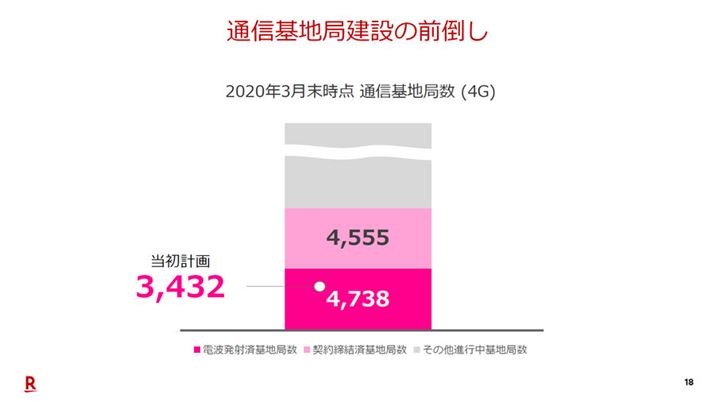 楽天は、2020年5月13日に行われた決算説明会で、懸案となっている楽天モバイルの基地局の設置状況を説明した。それによれば、2020年3月末時点における基地局数は当初計画の3,432に対して4,738と大幅な前倒しで進行しているとのこと。なお、地権者との契約が完了している基地局設置予定地の数は4,555か所(いずれも2020年3月末の数値)となっており、これと合わせると基地局数1万が視界に入ってきたことになり、2021年度中の人口カバー率では70%を達成できるとしている。