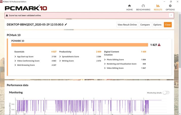 定番のベンチマークプログラムソフト「PCMark 10 Professional Edition」のスコアは1827。初代モデルよりもスコアは136アップしている