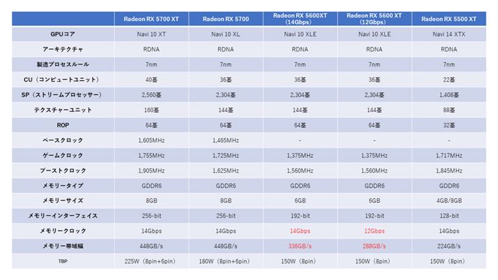 RDNAアーキテクチャーを採用する現行ラインアップのスペックをまとめたものがこちら。赤字で記載した部分が、今回のVBIOSアップデートによる変化点だ