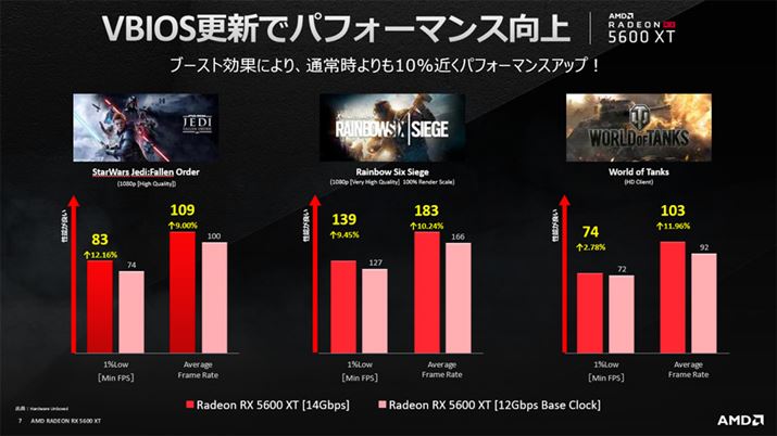 こちらのGPU、発表当初はメモリークロックが12Gbps相当となっていたが、ハードウェア的には14Gbps相当のスペックを当初から備えていたようで、一部メーカーは14Gbps相当にパフォーマンスアップできるVBIOSを提供していた。そして今年5月、14Gbps相当にアップデートできるモデルをAMDが正式に発表。発表当時は競合として「GeForce 1660 Ti」を想定していたが、VBIOSのアップデートでもうワンランク上の「GeForce RTX 2060」とも戦えるようになったとアピールする。