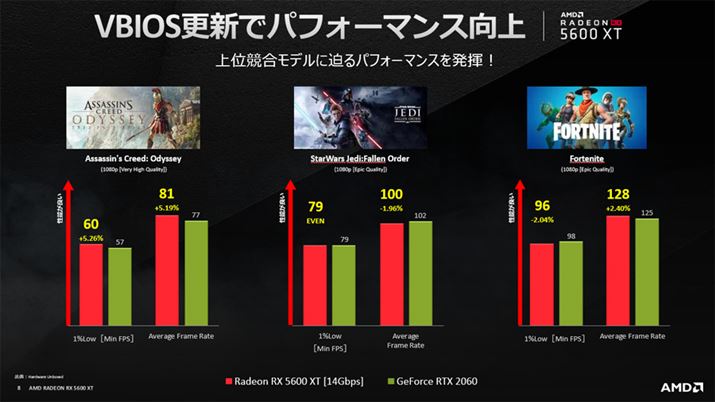 1月の発表時点での競合はGeForce 1660 Tiとしていたが、VBIOSのアップデートでもうワンランク上のGeForce RTX 2060とも戦えるようになったとアピール