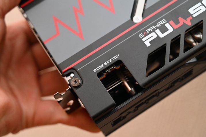 ボード裏面に用意されたBIOS切り替えスイッチ。メーカーページに用意されている専用アプリをダウンロードし、こちらのスイッチと組み合わせながら2種類のVBIOSを切り替える形だ