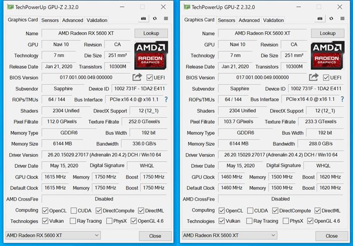 GPU-ZでSAPPHIRE「PULSE RX 5600 XT 6G GDDR6」の詳細をチェックしてみた。左がメモリークロック14Gbps相当のPerformanceモード、右がメモリークロック12Gbps相当のSilentモードを適応したときのもの。Performanceモードを設定すると、Texture FillateとBandwidthが向上しているのが確認できる