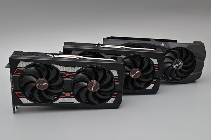 今回使用した3枚のビデオカード。前方からSAPPHIRE「PULSE RX 5600 XT 6G GDDR6」、SAPPHIRE「PULSE RADEON RX 5700 XT 8G」、ASUS「ROG-STRIX-RX5500XT-O8G-GAMING」