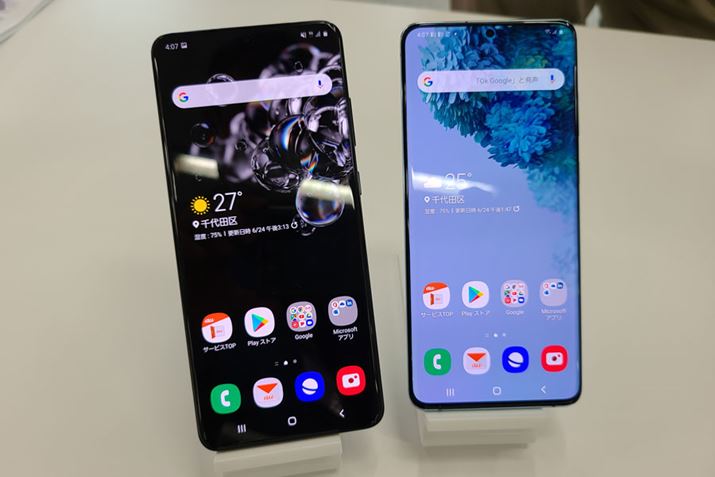 左が本機、右がGalaxy S20+ 5G。本機のほうがわずかにサイズが大きいが並べてみてもあまり違いはわからないレベル