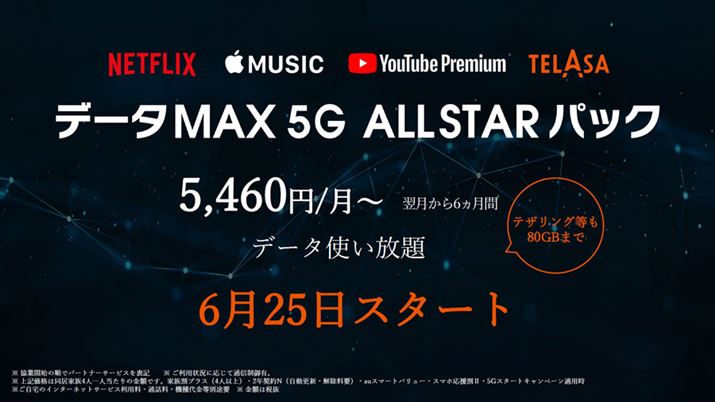 KDDI(au)は、2020年6月24日(水)、5G向けの新料金プラン「データMAX 5G ALL STARパック」を6月25日より開始すると発表した。「データMAX 5G ALL STARパック」は、国内のデータ通信使い放題に、「Netflix(ベーシックプラン)」、「Apple Music」、「YouTube Premium」、「TELASA」の各動画・音楽サブスクリプション(税別で月額合計3,300円相当)の利用アカウントをバンドルしたもの。月額料金は10,980円だが、月間通信容量が2GB以下の場合9,500円となる(いずれも、2年契約N適用、割引を一切適用していない場合の税別料金)。なお、テザリング/データシェア/国際ローミング通信のデータ通信容量は月間80GBとなっており、既存の5G向けデータ通信使い放題料金プランである「データMAX 5G」(税別月額8,480円)の月間30GB、「データMAX 5G Netflixパック」(月額9,480円)の月間60GBと比べてもかなり余裕がある。