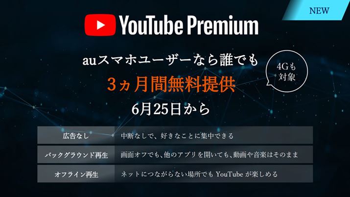 これとは別に、auの4G・5Gスマートフォンユーザー向けに「YouTube Premium」を3か月間無料で利用できる特典が2020年6月25日から始まる