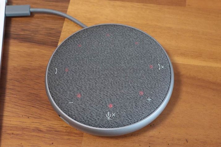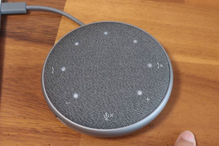 操作性も直感的です。上部にボリュームの上げ/下げ、マイクのミュート、受話と終話のマークがあり、タッチすると操作できます。マイクミュート中は赤いランプが付くので、ミュートし忘れを防ぎ、会議中に家族の声が先方に聞かれてしまうなんてこともありません。