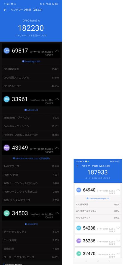 AnTuTuベンチマークの計測結果。左が本機、右が「Reno A」のもの。総合スコアはほぼ同じだが、グラフィック性能を表わす「GPU」のスコアは本機のほうが2万ポイントほど低い