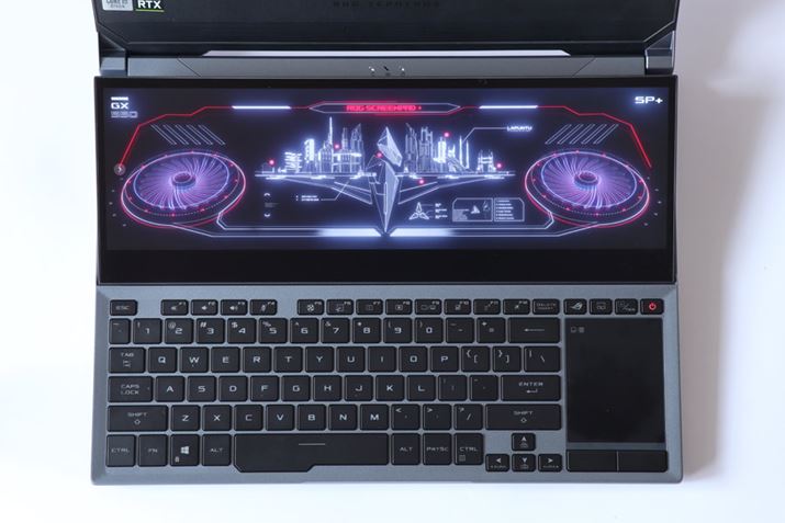 まずはROG Zephyrus Duo 15から見ていこう。“Duo”という名称から想像できるかもしれないが、本モデルは同社の2画面ノートPC「ZenBook Pro Duo」「ZenBook Duo」と同様、キーボードの奥に「ScreenPad+」というセカンドディスプレイを搭載した2画面のゲーミングノートPCだ。