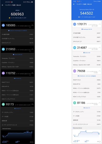 AnTuTuベンチマークの計測結果。左が本機で右が「Galaxy S20+」のもの。同じSoCを搭載しているが、MEMのスコアの違いなどにより1割近い差がついた