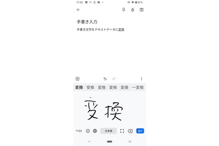 このとき、キーによる入力と同様に、文字などを手書きするたびに入力スペース上部に変換候補が表示される。変換候補をタップすれば、テキストデータとして入力が完了する。