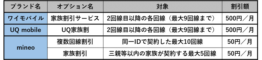 元々月額料金が安い格安SIMですが、一部の事業者では家族割引を提供しています。たとえばワイモバイルの場合、対象の料金プランを契約している2回線目以降の各回線(最大9回線)から毎月500円を割り引く「家族割引サービス」を提供。UQ mobileも同様の割引「UQ家族割」を提供しています。