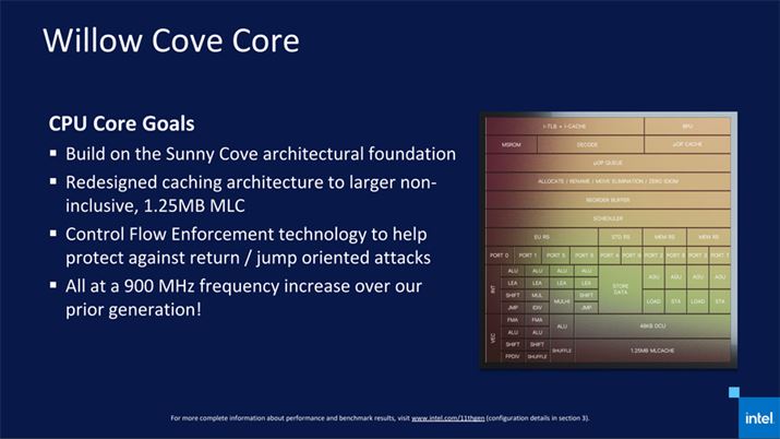 CPUコアは最新のWillow Coveアーキテクチャーで、10nm SuperFinテクノロジーの導入とアーキテクチャーの改良の合わせ技で、20%ほど性能が向上