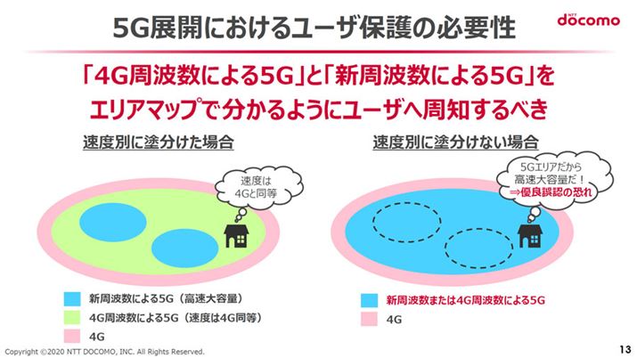 その理由として、4Gから転用される5Gの電波は、周波数の帯域幅自体は変わらないため、実質的な通信性能は4Gとほとんど変わらず、アンテナ表示が4Gから5Gと表示されるくらいの違いしかないと指摘している。NTTドコモでは、これでは「ユーザーが優良誤認を起こす恐れがある」として、“4G周波数による5G”と“Sub-6やミリ波といった5G用に割り当てられた新周波数による5G”は違うものだとユーザーに告知するべきだと主張した。