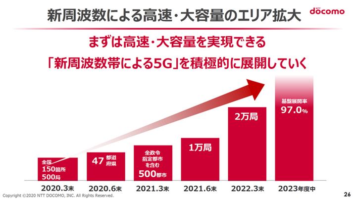 NTTドコモは、2020年8月25日、今秋以降の5Gのエリア展開について方針説明を行った。今年3月に国内でサービスが開始された5Gだが、半年が経過した今でも各社ともエリア展開はかなり限定されたものとなっている。しかし、この秋は、そうした状況を改善するのに有効な「4G用周波数帯の5Gへの転用」に向け、関連する法令の改正と、米・クアルコム社が発表した4Gと5Gの電波を共有し、随時帯域を切り替える新技術「DSS(ダイナミック・スペクトラム・シェアリング)」の実用化が予定されている。KDDI(au)やソフトバンクではこれらの政策・技術を積極的に導入する予定だ。しかし、NTTドコモは、今回の方針説明会でこれらの技術に一定の理解を示しながらも、現時点では採用しないことを表明した。