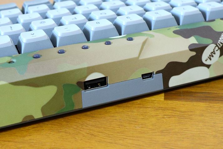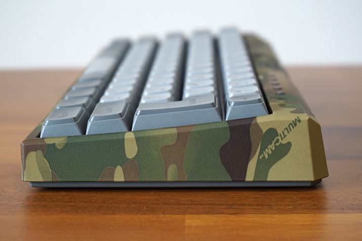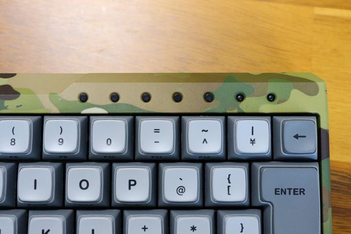 右上にBluetooth設定ボタン(左から4つ)、USB切り換えボタン(右から3つ目)、CapsLock LED(右から2つ目)、レベルチェックLED/ScrollLock LED(一番右)。今回試したCamouflageには印字はありませんが、Matte BlackやSky Grayなどには数字や文字が印字されています