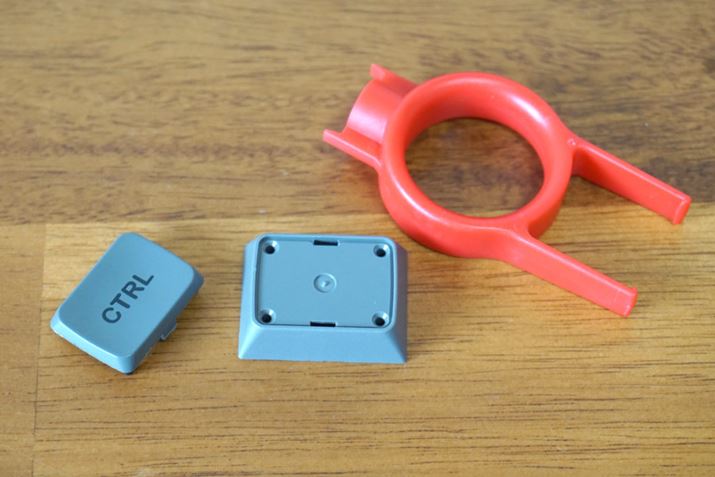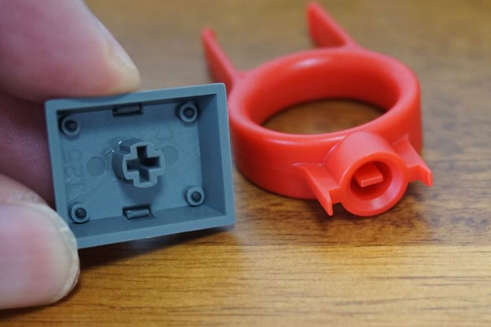 ベース部分とキートップ部分が別々になった「Patch Keycap(パッチキーキャップ)」。専用キープラーの逆側を使って外します。ちょっと力を入れないといけないので、壊さないように慎重に作業したいところ