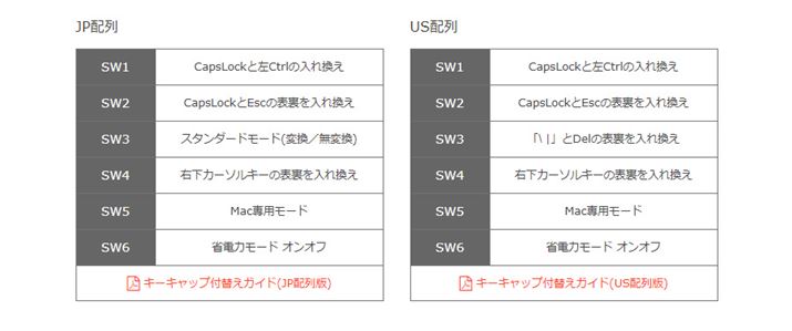 DIPスイッチだけ変えてもキーの印字は変わらなくて使いにくいという心配は不要。「Patch Keycap(パッチキーキャップ)」という2段階のキーで、印字を入れ替えることができます。ここまでやるかという、すごいこだわりです。