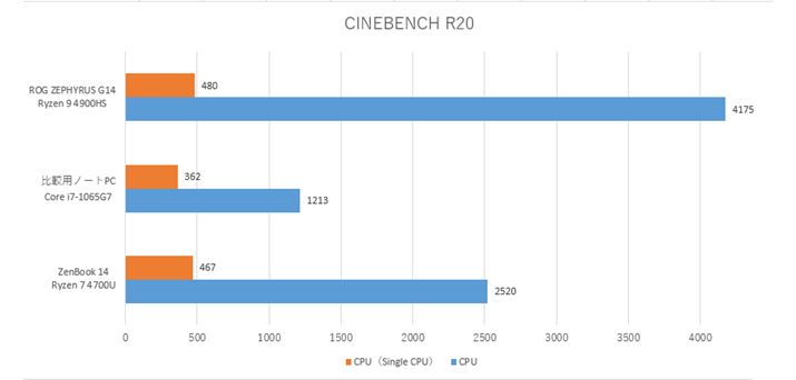 ベンチマークテストの結果は以下の通り。まずCPUの性能を測定する「CINEBENCH R20.060」の結果から見ていこう。比較用にインテルのCore i7-1065G7を搭載した他社製ノートパソコンと、「Ryzen 9 4900HS」という高性能なHシリーズを搭載した同社のゲーミングノートPC「ROG ZEPHYRUS G14」のデータと比べてみた。Ryzen 7 4700Uは、競合のCore i7-1065G7よりもシングルCPU、CPUともにスコアが高く、CPUにいたっては2倍も差がついた。さすがにRyzen 9 4900HSは頭ひとつ抜けた結果だが、シングルCPUのスコアならRyzen 7 4700Uも健闘している。