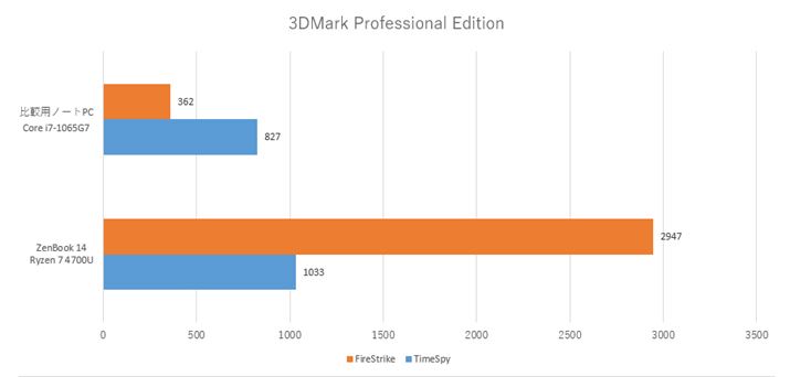 ゲーミングPCではないが、グラフィック性能を測定する「3DMark Professional Edition」も走らせてみた。比較はCINEBENCH R20.060と同じ、Core i7-1065G7を搭載したノートパソコン。「Iris Plusグラフィックス」という、CPU内蔵のGPUとしては高性能なCPUを搭載したモデルだ。結果は、Radeon グラフィックを搭載したZenBook 14 UM4251Aが圧勝。フォートナイトで比べても、Core i7-1065G7搭載モデルのフレームレートは、HDでも20fps前後といったところだった。