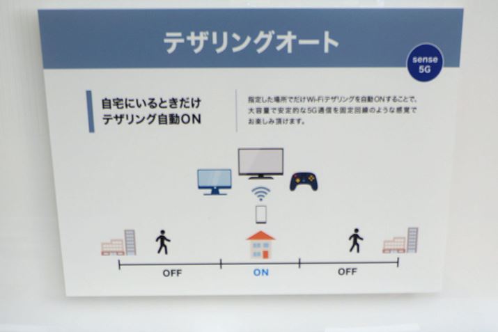 自宅など指定した場所に着くと、自動でテザリングが動作する機能「テザリングオート」を搭載。高速・大容量という5Gの特徴を生かした機能と言える