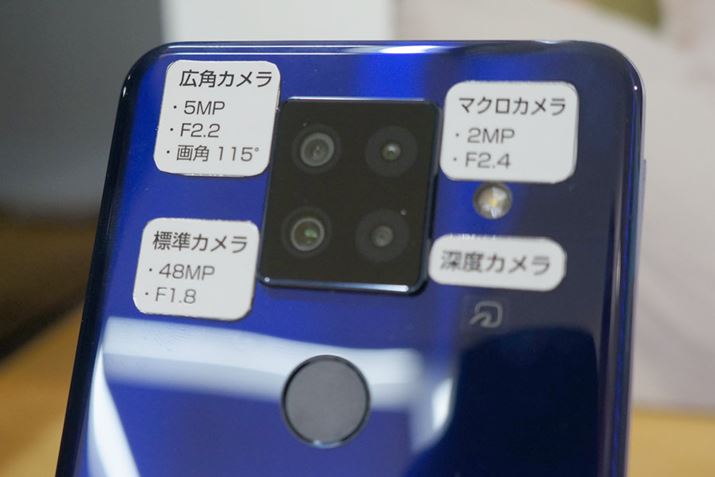 メインカメラは、約4,800万画素の標準カメラ(25.3mm)、約500万画素の広角カメラ(16.7mm)、約200万画素のマクロカメラ(24mm)、被写界深度センサーという組み合わせのクアッドカメラだ。望遠カメラではなく、マクロカメラを載せているのが特徴となっている。