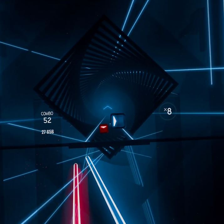 VRリズムゲーム「Beat Saber」のプレイシーン。同タイトルはさまざまなVRヘッドセット向けに配信されており、筆者も「PlayStaion VR」用をプレイしたことがあるが、画素感や表示のなめらかさは「Oculus Quest 2」に軍配が上がる
