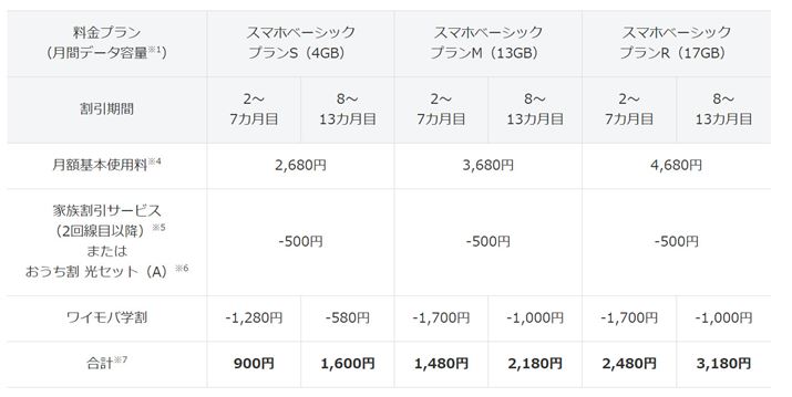 ソフトバンクは、2020年11月9日、「ワイモバイル」の新しい学割「ワイモバ学割」を2020年11月11日〜2021年5月31日の期間に実施すると発表した。「ワイモバ学割」は、5〜18歳までのユーザーを対象に、「スマホベーシックプランS/M/R」の各プランの割引きを行うというものだが、今回その家族ユーザー(同一の家族グループに加入していること)が契約した際にも割引の対象となった。ワイモバイルでは最安となる月額2,680円の「スマホベーシックプランS(月間通信容量4GB+国内5分以内の無料通話付き)」の場合、契約2〜7か月目までは月額1,280円、8〜13か月目までは月額580円の割引きが適用される。これに既存の「家族割引サービス」(月額500円)を合わせると、契約2〜7か月目までは月額900円、8〜13か月目までは1,600円で利用できる計算となる。詳細は以下の料金表を参照。