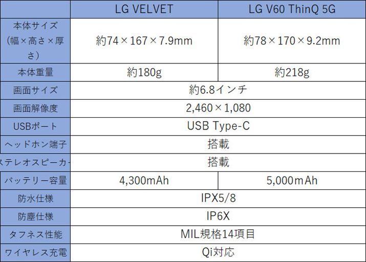 まずは、「LG VELVET」と「LG V60」のボディサイズや機能の有無を以下の表にまとめたので見てほしい。