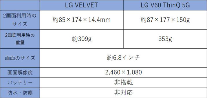 両機の最大の特徴である2画面表示は、いずれもディスプレイを備えた専用ケース「LGデュアルスクリーン」を装着することで行う。この「LGデュアルスクリーン」は、「LG VELVET」も「LG V60」も機能的には共通で、本体と同じ約6.8インチの平面有機ELディスプレイを備え、バッテリーは内蔵されておらず、電力は本体のバッテリーから供給される。なお、防水・防塵、タフネス仕様には対応していない。また、「LG VELVET」については、「LGデュアルスクリーン」が同梱しない本体だけ(70,488円)のパッケージも用意されている。