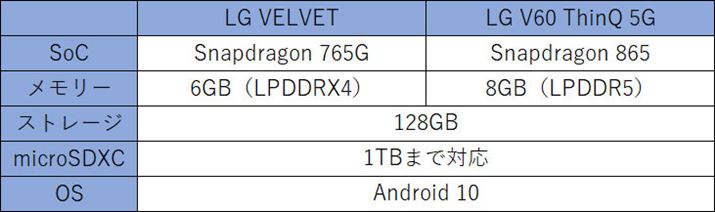 搭載されるSoCを見ると、「LG V60」に搭載される「Snapdragon 865」はハイエンド向け、「LG VELVET」の「Snapdragon 765G」は価格と性能の調和を図ったミドルハイ向けと異なっている。また、メモリー容量も、「LG V60」が8GB、「LG VELVET」が6GBと異なっている。この違いが、実際の処理性能や体感速度でどれくらいの差となるのかがポイントになるだろう。