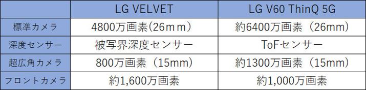 両機種とも、メインカメラに標準カメラと超広角カメラを搭載する点は共通で、それぞれの焦点距離も共通しているが、画素数は「LG V60」のほうが上だ。なお、構図の認識のための補助カメラとして、「LG V60」がToFセンサーを、「LG VELVET」が被写界深度センサーを備えている。