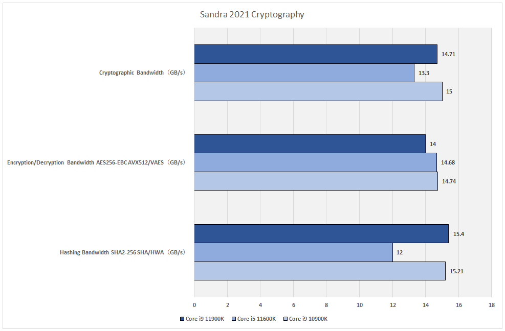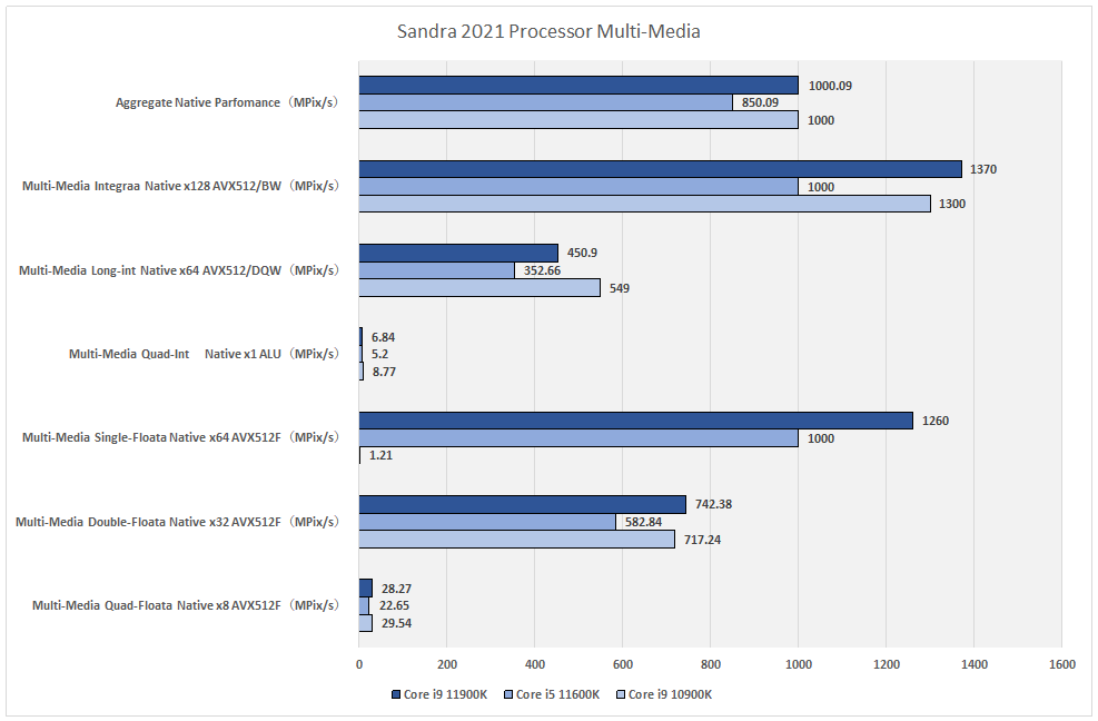 CPUの計算能力を測るProcessor Arithmeticは、物理コア数の多い順になったいっぽうで、マルチメディア関連のパフォーマンスを測るProcessor Multi-Mediaは、Core i9 11900KとCore i9 109900Kの差がかなり縮まっている。このあたりは、CPUアーキテクチャーの変更、メモリーの動作クロック引き上げが有利に働いているのかもしれない。