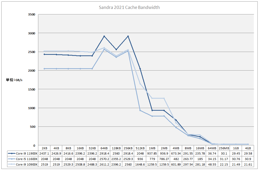 メモリー帯域を測るMemory Bandwidthは、DDR4-3200対応となったCore i9 11900KとCore i5 11600KがCore i9 10900Kを上回る結果に。Cache Bandwidthは、Rocket Lake-SとComet Lake-Sの間でキャッシュ周りの設計に大きな変更がなかったためか、全体的な傾向はRocket Lake-SとComet Lake-Sの間で差はなかった。