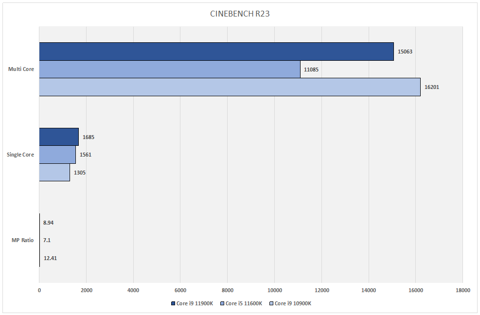 CINEBENCHのマルチコア性能は、10コアのCore i9 10900Kがトップだが、8コアのCore i9 11900Kもかなり検討。シングルコア性能は、CPUコアアーキテクチャーの変更でIPC向上を果たした最新世代のCore i9 11900KとCore i5 11600Kが力を見せつけた形となっている。POV-ray v3.7もほぼ似たような傾向だ。