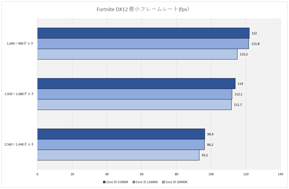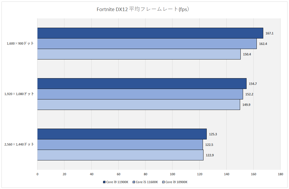 Fortniteを使用。レンダリングモードを「DIRECTX 12(ベータ)」、クオリティプリセットを「最高」、ウィンドウモードを「フルスクリーン」、最大フレームレートを「無制限」に変更。そのほかの設定は変更せず、プリセットに従う。1,600×900ドット、1,920×1,080ドット、2,560×1,440ドットの3種類の解像度で計測を実施している。なお、Fortniteにはベンチマークモードが用意されていないため、計測にはCapFrameXを使用し、リプレイデータの特定シーン1分間を再生した時のフレームレートを計測。平均フレームレートは、CapFrameXのAverageの値、最小フレームレートはCapFrameXのP1の値を採用している。