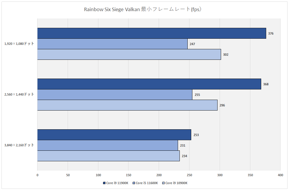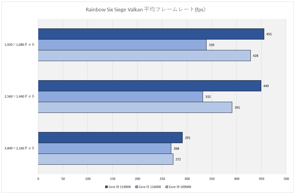 Vulkan API版のRainbow Six Siegeのベンチマークモードを使用。総合品質を「最高」に変更。そのほかの設定は変更せず、プリセットに従う。1,920×1,080ドット、2,560×1,440ドット、3,840×2,160ドットの3種類の解像度で計測を実施し、計測値はベンチーマーク結果の値を採用している。