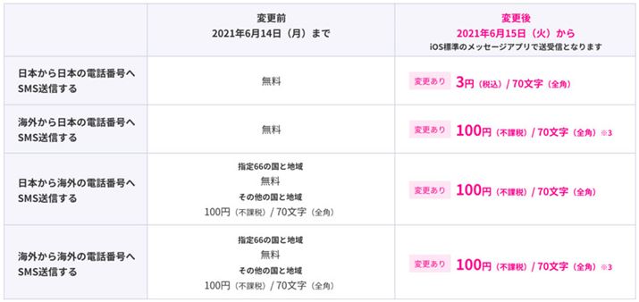 SMSは基本的にiOS標準のSMSアプリを使うため、SMSの送信は有料となる。なお、送り先がRakute Linkを利用している場合のみ、Rakute LinkからSMSが利用可能、その場合は従来どおり無料で利用できる。iOS標準アプリを使ったSMSの送信料金は以下の通り。