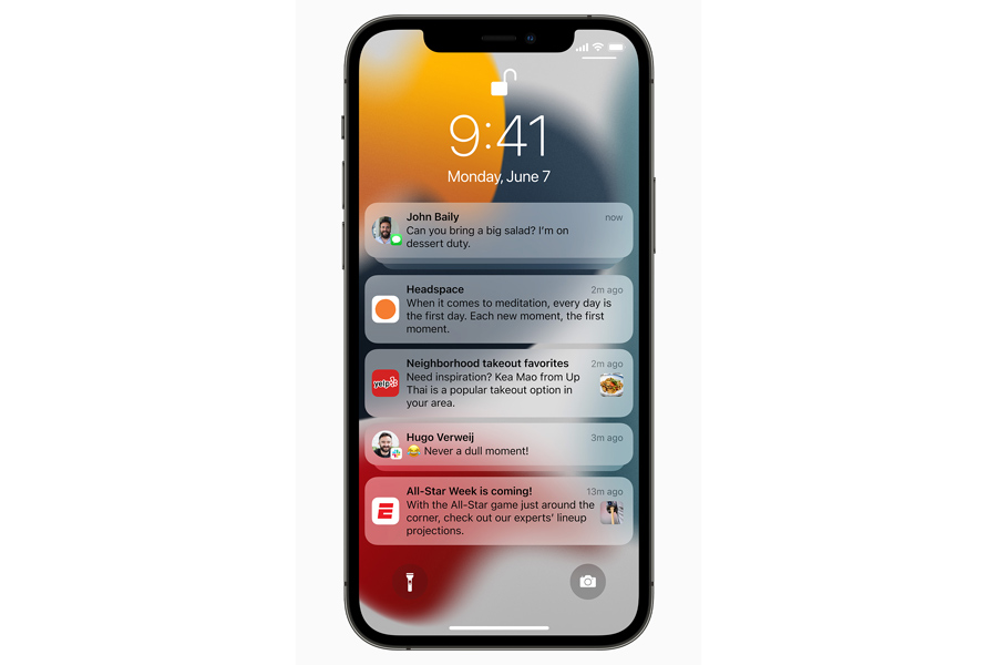 「通知」は、アプリのアイコンが大きくなり、見分けがつきやすくなる。バラバラと届く通知をまとめた「通知要約」という新機能も用意。自分が設定した好きな時間、たとえば朝晩など決まった時間に通知をまとめて受け取ることも可能になる。なお、この「通知要約」には人からの通知は含まれない。「集中モード」という新しいモードも登場。睡眠中と同じように、メッセージ相手に今の状況を伝えられるというもので、仕事や勉強に集中したいときに、この集中モードにすれば通知も表示されず、作業に集中できるというわけだ。
