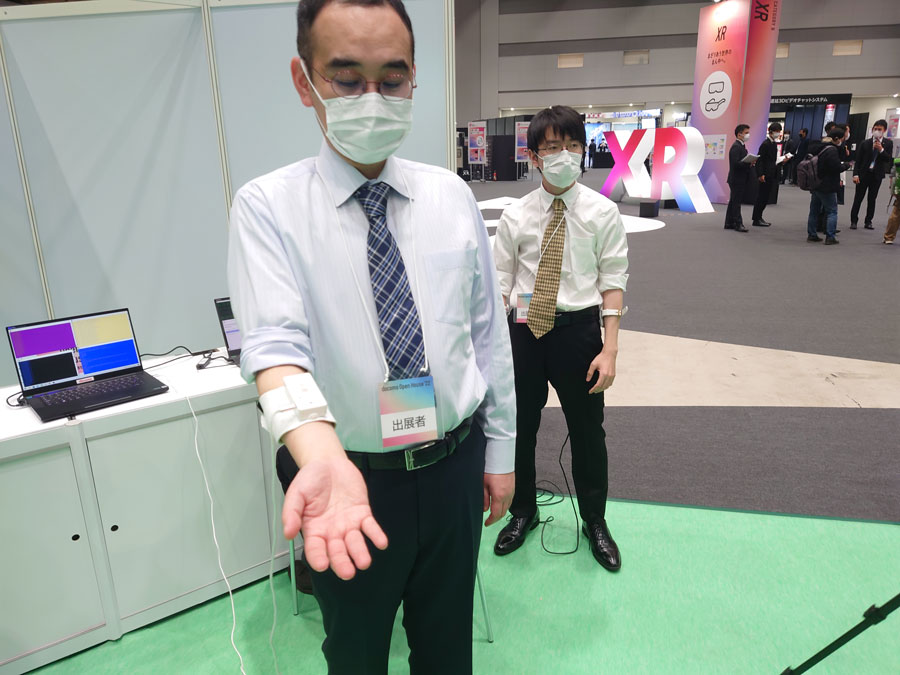運動情報を他人に伝えるデモンストレーション。センシングデバイスを装着した後方の人が手や指を動かすと、アクチュエーションデバイスを装着した前方の人にその動きが電気信号として運動神経に伝わり、同じような動きをする。人ごとに異なる感覚や運動情報を最適化しているのが技術上のポイントという