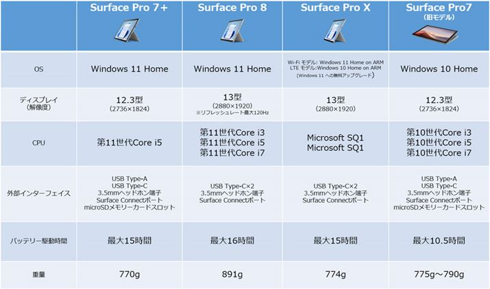 上の表は、現行の「Surface Pro」シリーズと、旧モデル「Surface Pro 7」の主なスペックを比較したものだ。「Surface Pro 8」と「Surface Pro X」はいずれも13型の大きなディスプレイを搭載しているが、それ以外の点で、これらと「Surface Pro 7+」のスペックを比べても、実はさほど大きく劣っているわけではないことがわかる。もちろん、「Surface Pro 8」は「Surface スリム ペン 2」の触覚モーターによるフィードバック機能が使えたり、ディスプレイのリフレッシュレートが最大120Hz(標準は60Hz)に対応していたり、すぐれている点も多くあるが、人によっては手持ちの周辺機器との互換性が高いUSB Type-Aポートを備えた「Surface Pro 7+」のほうが使いやすいと感じるかもしれない。